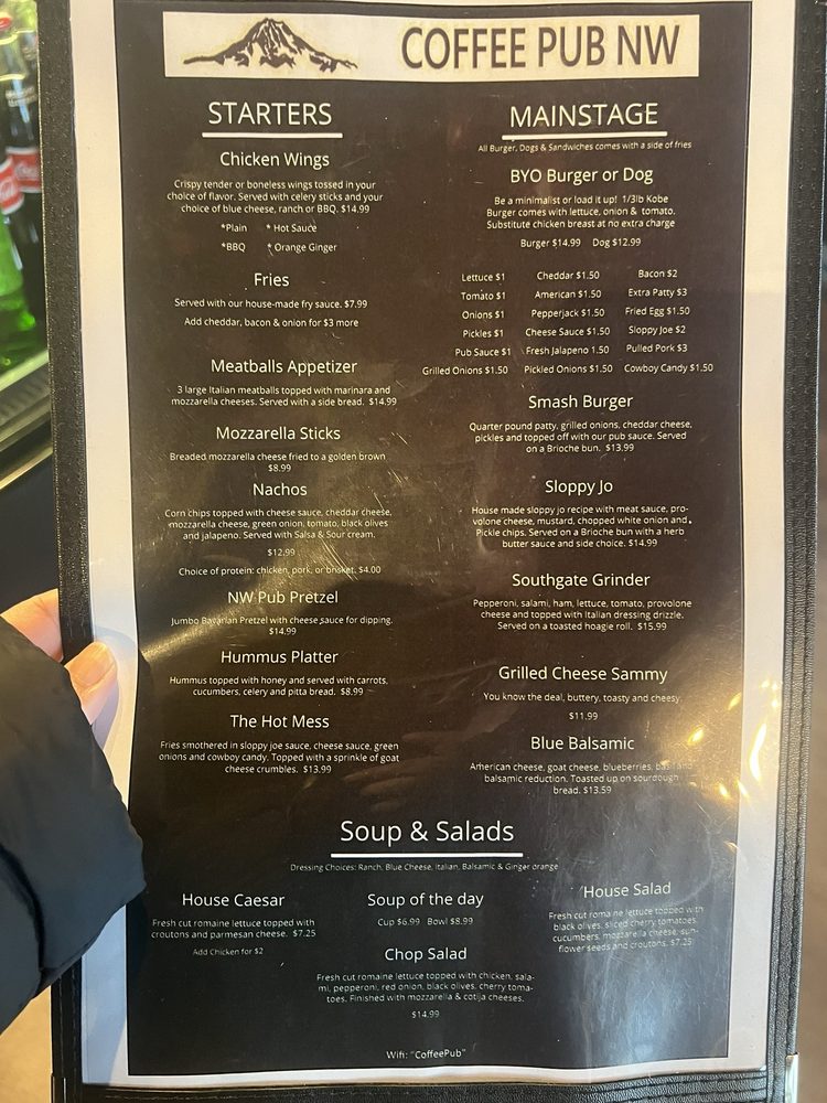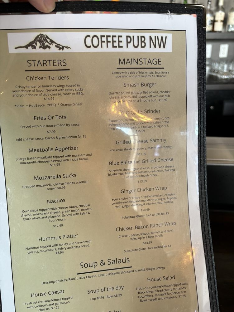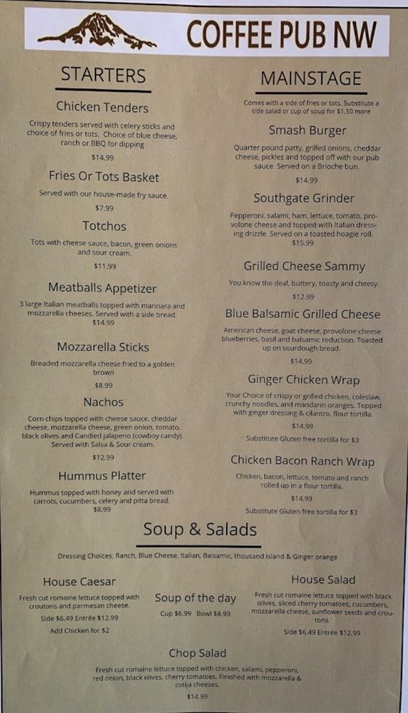 Welcome to Coffee Pub NW, a charming culinary haven located at 804 79th Ave SE Suite 108, Tumwater, WA. The menu showcases a delightful selection of appetizers, bold entrées, and fresh salads that are sure to please every palate. Begin with their Art Dip, a creamy artichoke delight perfectly paired with tortilla chips or pita bread. For something heartier, try the Smash Burger—a quarter-pound patty topped with grilled onions and pub sauce, served on a fresh brioche bun.